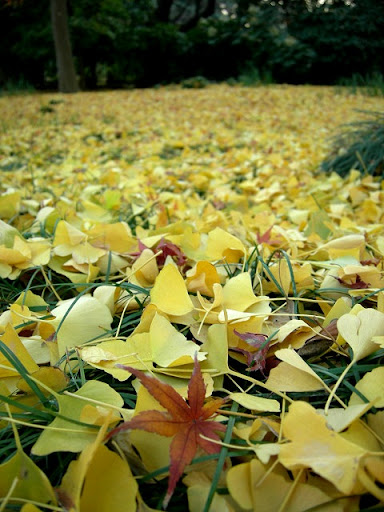 一面まっ黄色のいちょうの落ち葉で一杯です。その中に、秋もお出迎えです。